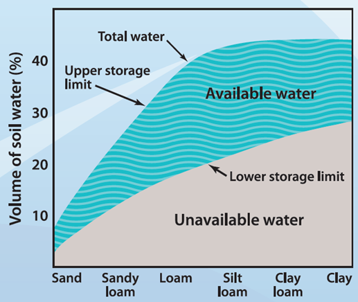 The soil moisture readings are site and soil specific and indicate the amount of soil water available to the plant. Different soils depending on their texture, structure and organic matter content have different capacity to hold and release water. Soil texture is the main driving factor. Clay soils have greater water holding capacity than sandy soils which tend to drain more freely (Figure 1). For example, a clay soil showing 100% soil moisture will have a lot more stored soil moisture and water available for plant growth compared to a sandy loam soil also showing 100% soil moisture.